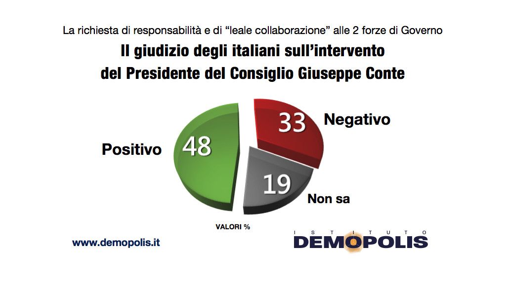 Quasi la metà degli italiani, secondo l’indagine dell’Istituto Demopolis per il programma Otto e Mezzo, esprime un giudizio positivo sull’intervento del presidente del Consiglio Giuseppe Conte, che – in conferenza stampa – ha chiesto un’assunzione di responsabilità alle 2 forze di Governo, invitando Lega e M5S ad una “leale collaborazione” dopo settimane di conflittualità che hanno rallentato l’attività dell’Esecutivo. Una valutazione negativa è espressa da oltre un terzo dei cittadini, mentre il 16% non esprime un’opinione in merito.