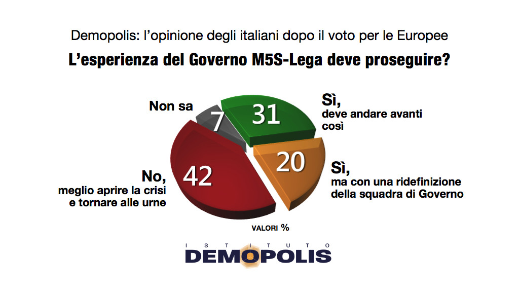 Per la maggioranza assoluta degli italiani l’esperienza del Governo Conte deve proseguire: per il 31% dovrebbe andare avanti così; per il 20% con una ridefinizione della squadra di ministri. Poco più di 4 cittadini su 10 ritengono, invece, che sarebbe meglio aprire la crisi e tornare alle urne. Sono i dati che emergono dall’indagine dell’Istituto Demopolis, diretto da Pietro Vento, che ha analizzato gli umori dell’opinione pubblica sul futuro dell’Esecutivo dopo il voto per le Europee.