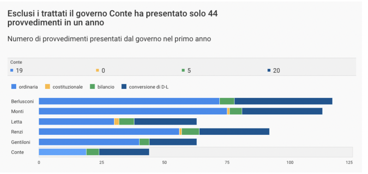 Nel primo anno di governo l’esecutivo Conte ha presentato 117 provvedimenti al Parlamento. Escludendo le 72 ratifiche di trattati internazionali, il totale scende a 44. Il 45% di queste proposte sono decreti legge, e si tratta dal governo Berlusconi in poi della percentuale più alta. Mai dal 2008 ad oggi il peso dei decreti sui disegni leggi del governo è stato così importante.