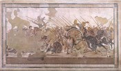 Nella domus in cui era, il mosaico decorava il grande pavimento dell’esedra. La Battaglia di Isso è un unicum non solo nelle dimensioni, ma anche nello stato sostanzialmente buono di conservazione, dato che le ampie lacune che ci sono nella sezione sinistra dell’opera non impattano sul fulcro della raffigurazione, la testa di Alessandro, occhi e riccioli neri che catturano subito lo sguardo di chi osserva.