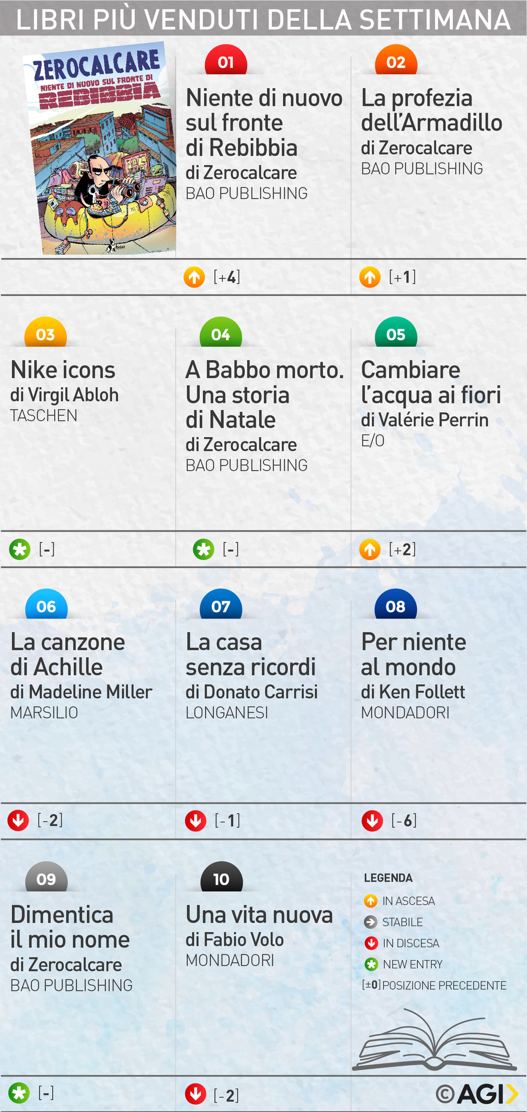 AGI – Questa settimana Zerocalcare, sulla scia del successo di “Strappare lungo i bordi”, conquista le prime due posizioni della classifica dei libri più venduti negli store della Feltrinelli. In prima posizione una sua nuova uscita, “Niente di nuovo sul fronte di Rebibbia” in cui il fumettista romano raccoglie una serie di storie che affrontano dalla condizione dei carcerati di Rebibbia durante la prima ondata della pandemia all’importanza della sanità territoriale, da una disamina approfondita sul fenomeno della cancel culture alla condizione degli ezidi in Iraq; si tratta di una raccolta di storie di Zerocalcare tra le più “serie” della sua carriera, ed è impreziosita da una storia inedita di quasi cento pagine sull’ultimo anno della sua vita, quando si stava occupando della suo debutto su Netflix.