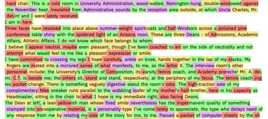 L’analisi del testo finale da parte di GLTR è molto semplice. Prendendo ad esempio una pagina di Infinite Jest, capolavoro di David Foster Wallace, è possibile vedere come: