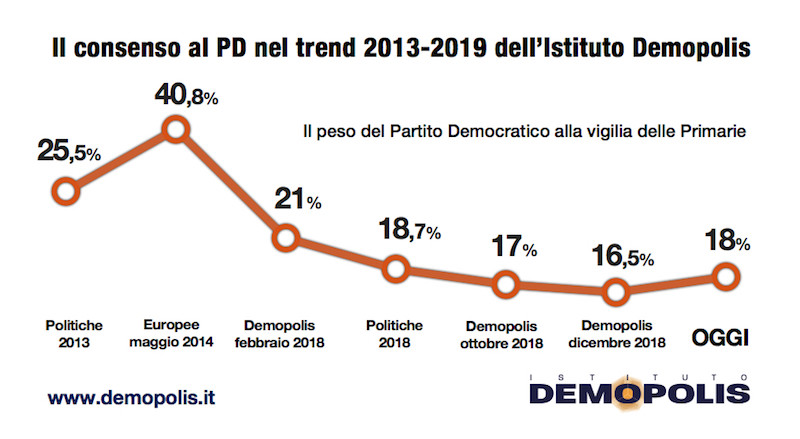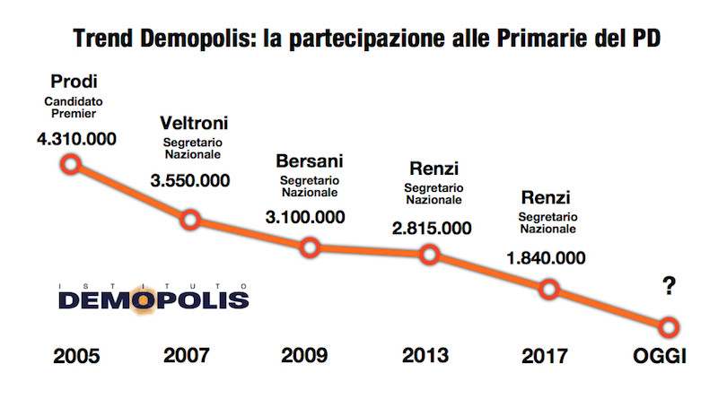 Da Prodi a Veltroni, da Bersani a Renzi il numero dei votanti alle Primarie del Pd è andato sempre diminuendo: è una tendenza che difficilmente si invertirà. Nel 2007 in 3 milioni e mezzo parteciparono alle Primarie che videro l’elezione a segretario di Walter Veltroni. Nel 2013, in 2 milioni e 800 mila si recarono ai gazebo in occasione della vittoria di Renzi; un milione in meno riconfermarono l’ex Premier alla Segreteria nel 2017.