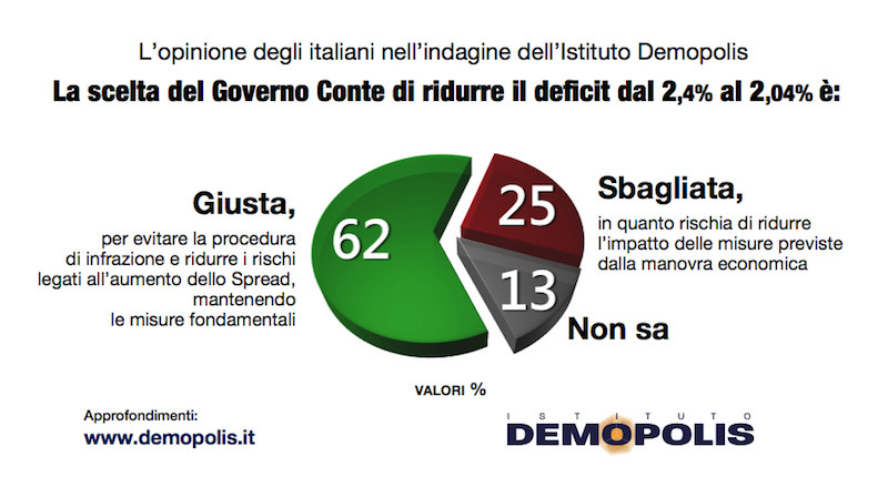 La scelta del Governo Conte di ridurre il deficit previsto per il 2019 dal 2,4 al 2,04% è ritenuta giusta dal 62% degli italiani, convinti dell’opportunità di evitare la procedura d’infrazione e i rischi dello spread, mantenendo però le misure economiche fondamentali. Per un quarto dei cittadini si tratta invece di una scelta sbagliata che rischia di ridurre l’impatto delle scelte previste inizialmente nella manovra dell’Esecutivo M5S-Lega. È uno dei dati dell’indagine condotta dall’Istituto Demopolis, diretto da Pietro Vento.