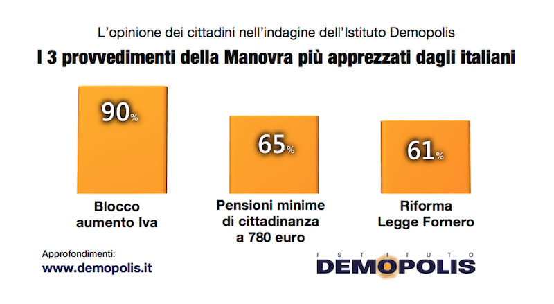 “Sono tre – spiega il direttore dell’Istituto Demopolis Pietro Vento – i provvedimenti contenuti nella manovra che l’opinione pubblica sembra apprezzare maggiormente: il blocco dell’aumento Iva, indicato da 9 cittadini su 10; le pensioni minime di cittadinanza a 780 euro, la riforma della legge Fornero a quota 100”.