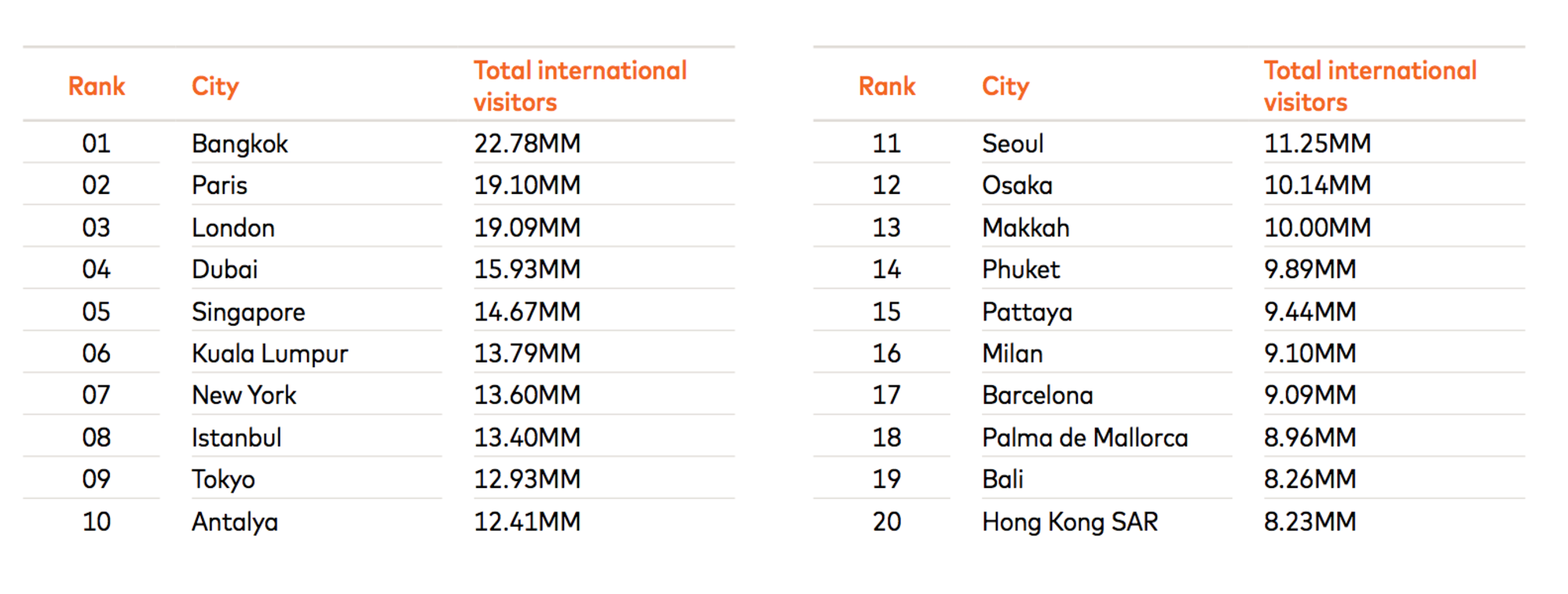 A guidare il ranking è Bangkok, capitale della Thailandia, con oltre 22 milioni di visitatori seguita dai grandi classici rappresentati da Parigi e Londra, entrambi sopra i 19 milioni, e le mete legate al mondo dell’innovazione e del futuro come Dubai, quarta con quasi 16 milioni, e Singapore, con poco meno di 15 milioni di turisti. Chiudono la Top Ten, dal sesto al decimo posto, Kuala Lampur, New York, Istanbul, Tokyo e Antalya.
