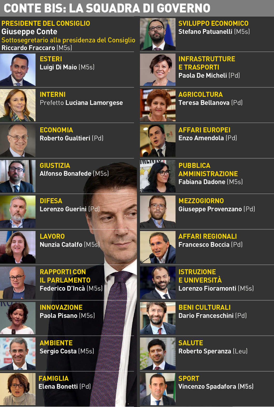 Sei in totale gli esponenti della precendente compagine governativa che continueranno il loro percorso. Un esecutivo, il Conte 2, che – numeri alla mano – sarà composto per metà da esordienti nel ruolo di ministri o con incarichi di governo. A mantenere il loro posto il pentastellato Alfonso Bonafede che conserva la delega alla Giustizia e Sergio Costa quella all’Ambiente. Poi c’è il leader M5s Luigi Di Maio, che però passa dal ruolo di vice-premier e ministro del Lavoro agli Esteri.