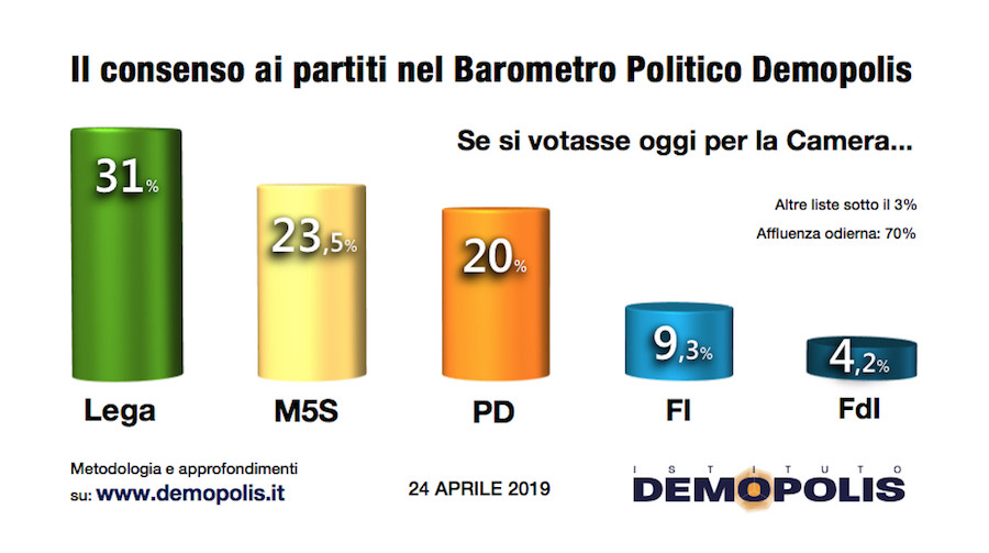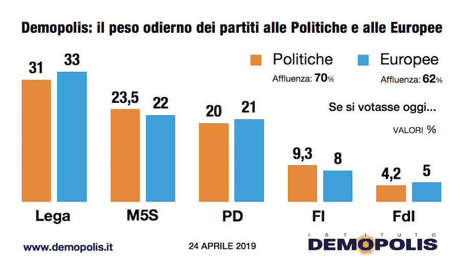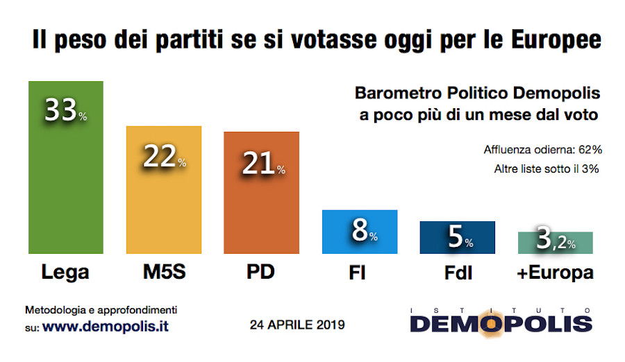 Secondo la fotografia scattata dall’Istituto Demopolis per il programma Otto e Mezzo, a poco più di un mese dal voto del 26 maggio, la Lega di Salvini otterrebbe alle Europee il 33%, il Movimento guidato da Luigi Di Maio il 22%, il Partito Democratico il 21%; distanziati Forza Italia all’8% e Fratelli d’Italia al 5%. Più Europa avrebbe poco più del 3%, mentre sarebbero distanti dalla soglia di sbarramento del 4% le altre forze minori.