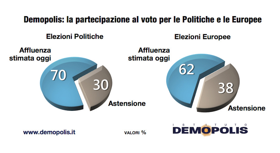“In parte differente – spiega il direttore di Demopolis Pietro Vento – sarebbe lo scenario nel voto per le elezioni Europee, caratterizzate da un significativo incremento dell’astensione. Se la partecipazione al voto per le Politiche si attesta intorno al 70%, Demopolis stima invece al 62% l’affluenza per le Europee: 8 punti in meno, destinati ad incidere sulle percentuali del consenso ai partiti”.