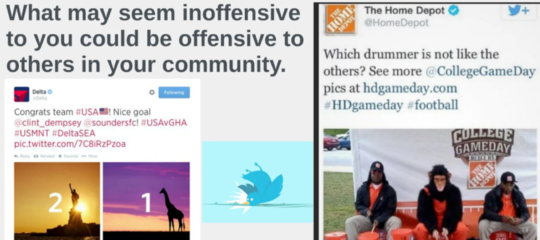 Anche qui la direttiva della presentazione è molto chiara: “Ciò che può sembrare inoffensivo per te potrebbe essere offensivo per gli altri nella tua comunità”. Il razzismo, il sessismo, l’insulto, anche involontari, sono rischi in cui è facile cadere. Bucce di banana scivolosissime.